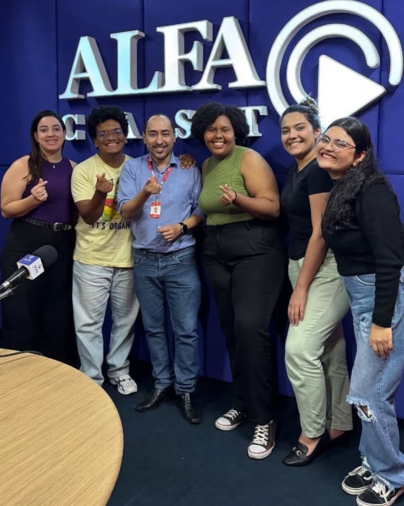 Calouros do curso de jornalismo da Universidade Alves Faria (UNIALFA) relatando como é a sensação de entrarem em uma faculdade e o porquê se interessaram pelo curso, no podcast Pod Chegar Pra Cá.